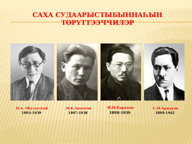 - Бу Саха омугар улахан ситиһии, саҥа сайдыыга төһүү күүс буолбута. Маны ситиһэргэ саха чулуу уолаттара Өлөксөй Кулаковскай, Баһылай Никифоров, Хабырыыс Ксенофонтов, Махсыым Аммосов, Былатыан Ойуунускай, Ыстапаан Аржаков, Исиидэр Барахов уонна да атыттар кылааттара үгүс.